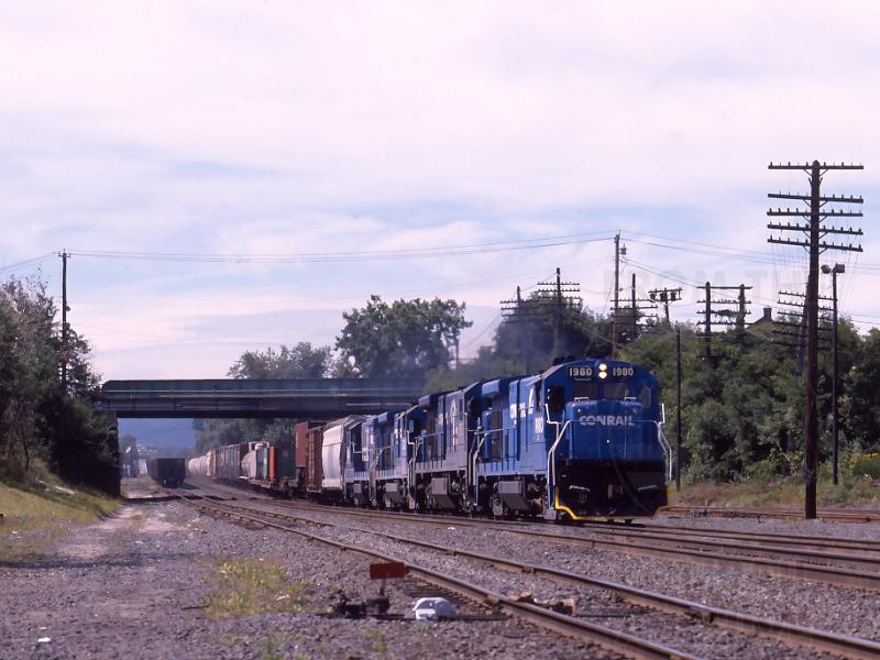 B23-7 1980 leads SEPA through North Adams Jct. in Pittsfield, MA. on Aug. 27, 1989. By this point in time, the 1980 had lost it's special "Keep it moving with ConRail" logo, but had gained acceptance into third rail territory.