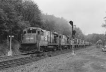 A gaggle of six B23-7's, led by the 2007, have an SENH in tow by the old depot in Dalton, MA. on July 21, 1984. These half dozen B-Boat lash-ups were not uncommon on the B&A, and were fun to hear, especially compared to the "stealth" C30-7A's, which were only a month away from taking over the B&A at this time. This photo really fits the "Signals and detectors" listing, since both are in evidence.