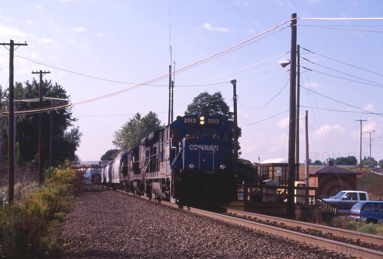 Looks can be deceiving! Connecticut Southern road turn CSO-1 (Cedar Hill, New Haven-West Springfield, MA.) heads northward past the "Amshack" in Windsor Locks, CT. on Sept. 26, 1997. When CSO took over the remaining CR branches in the Hartford area of Connecticut they leased CR B23-7's 2008-2013 for their start-up and the train seen here is operating over the Amtrak Springfield line.
