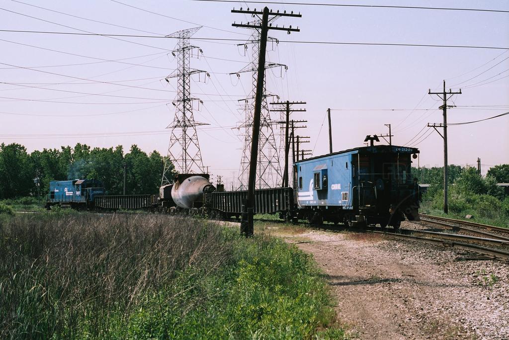 With class N21 caboose 21206 trailing, Conrail's hot metal train diverges from the Bernice Cut-off to the IHB connection in July 1992. Doug Davidson photo with permission