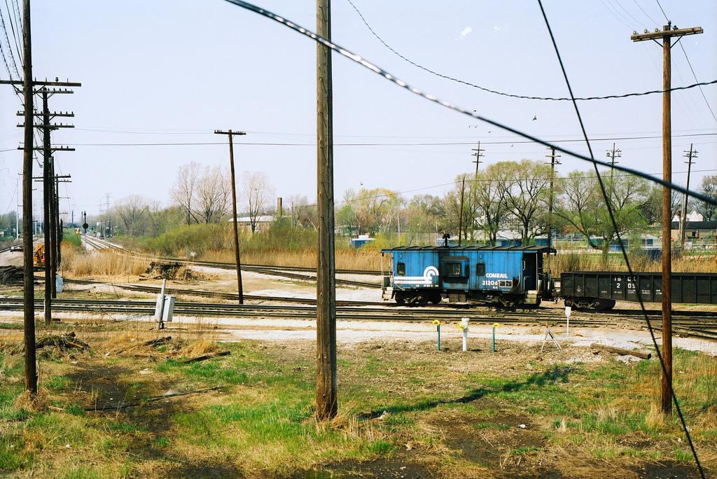 Conrail class N21 bay window caboose 21206 brings up the rear of the hot metal train, in a view from Dolton Tower in May 1997. Doug Davidson photo with permission