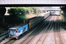 A Conrail bay window caboose, class N21 21219, brings up the rear of a westbound freight at Toledo in August 1993. Doug Davidson photo with permission