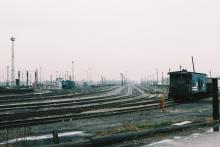 View looking south at the north end of Conrail's 51st Street Yard in April 1987. Prior to the formation of Conrail in 1976, this yard was the Erie Lackawanna's major Chicago terminal. Class N21 caboose 21255 sits off to the right side of the photo. Doug Davidson photo with permission