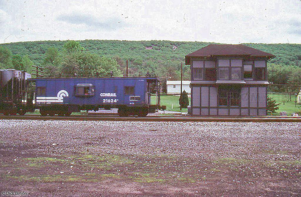 Conrail class N7A caboose 21624 is seen passing GRAY tower in Grazierville, PA in 1983.