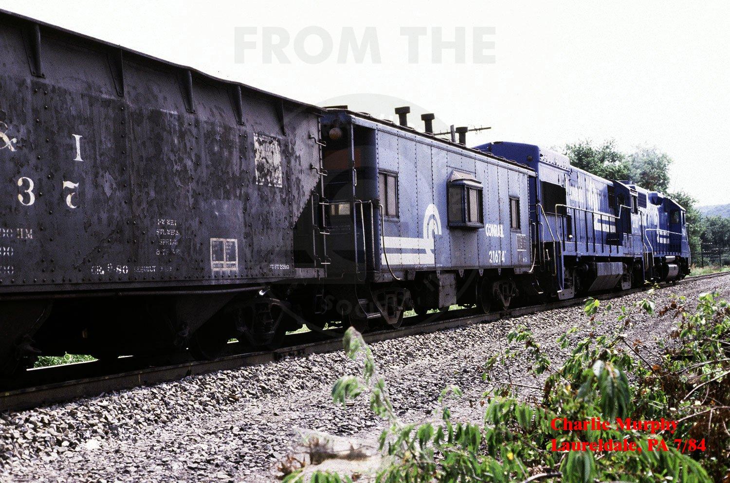 Conrail 6095, the former EL 3630 with the sanders on leads two SD50's and a C30-7A on a Bethlehem bound UBB coal train at Laureldale, PA on the former Reading East Penn branch Hill track in August 1984. This would be the last of three SD45's, all leading that I would see that Summer. More SD50's and C36-7's would soon arrive to permanently sideline the SD45's. The 2718 & 7944 were the pushers on the rear.
