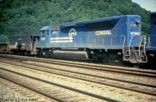 CR 6686, former EL 3655, is pushing hard against an ex-NYC N7A class cabin CR 21691 at Horseshoe Curve in August, 1978.