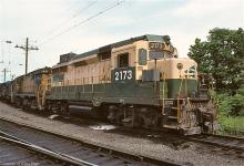 CR GP-30 2173 (ex-RDG 3605) and C424 2495 (ex-RDG 5206) rest in lines of power by the Morrisville shops in July, 1978.