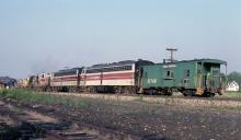 Even as power short as Conrail was in those first years, some of the heritage units were in bad shape or too old to fix, hence scenes like this of funeral trains. With a big chunk of the former Erie Lackawanna Marion deadline, this Conrail eastbound passes through Orrville, Ohio on the ex PRR in August of 1976. Penn Central N7A #21749 brings up the rear. Two E8's (820 and 829), 2 RS-3's, 2 S2's (including #520 still in pure "Erie" black), 2 more RS-3's, and 2 more E8's are visible in this view. Some of the E's and RS's would languish at Altoona for a while, but the S2's would pass this way again as they headed for Chicago as trade in material, better known as "scrap"....