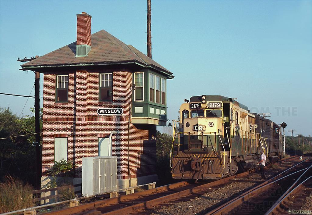 Conrail GP30 2179 (ex-RDG 3611) is seen on WPCA-51 as it reverses past Winslow tower to get its train on 9/13/1979