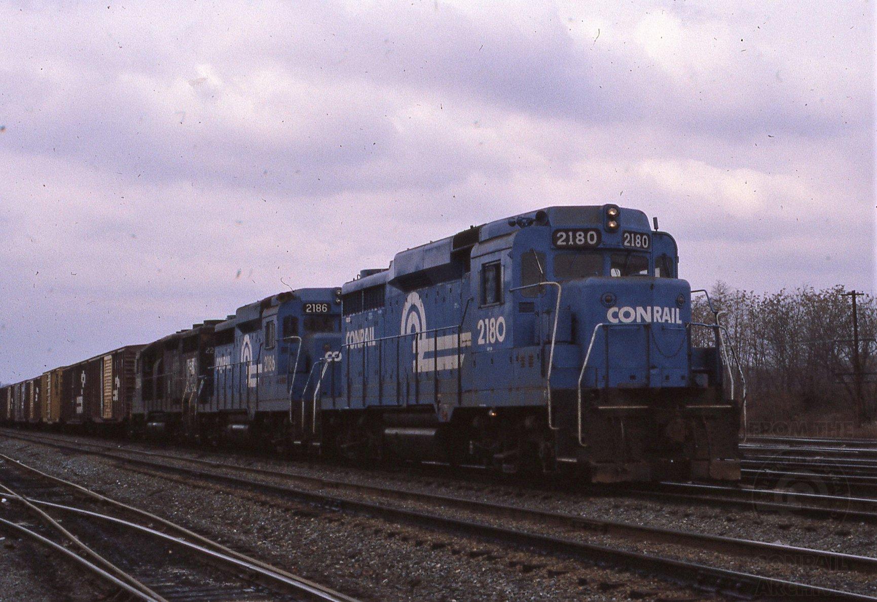 3 GP30s, 2 ex RDG (3612 and 3618) and one ex PRR ex PC lead a train out of Abrams, December, 1981.