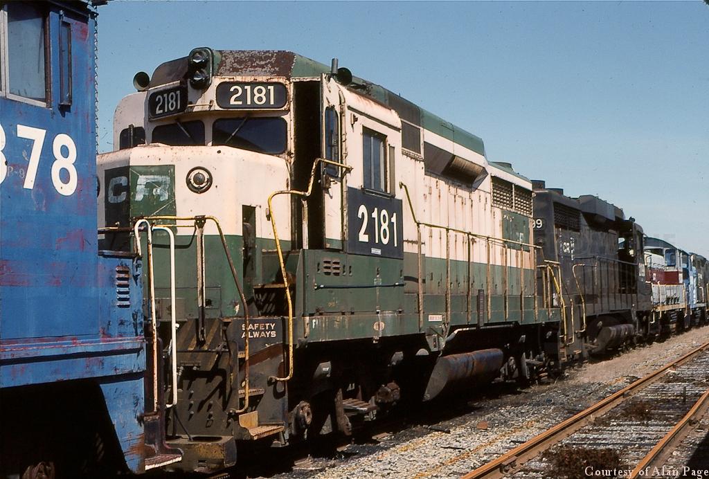CR GP30's 2181 (ex-RDG 3613) and 2199 rest at Rutherford with other stored units in April, 1984.