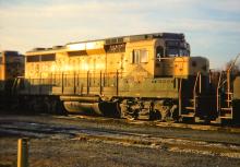 With the sun going down in November, 1976, former RDG GP-30 3618 rests between other ex-RDG units at the Abrams engine terminal.