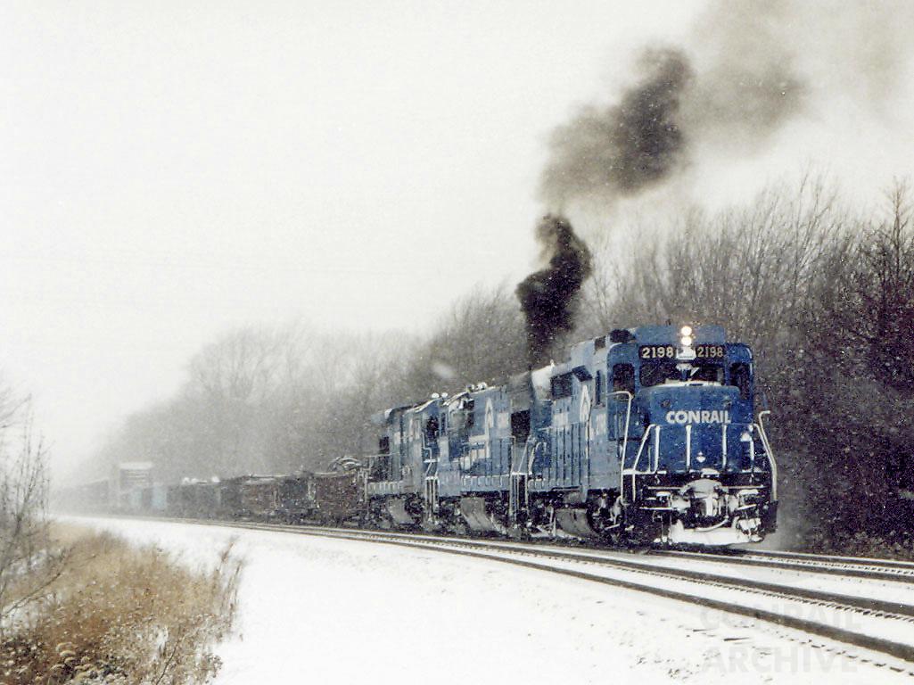 A southbound Conrail freight is approaching West 58th St bridge in a snowstorm on Conrail's Youngstown Line.