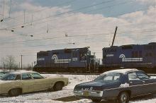 CR ex-PC GP-30 2211 and GP-9B 3812 work in the snow at Morrisville in March, 1978. GP30's replaced the Alco RSD12's and RS-11's that worked Morrisville yard into the summer of 1977.