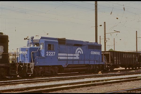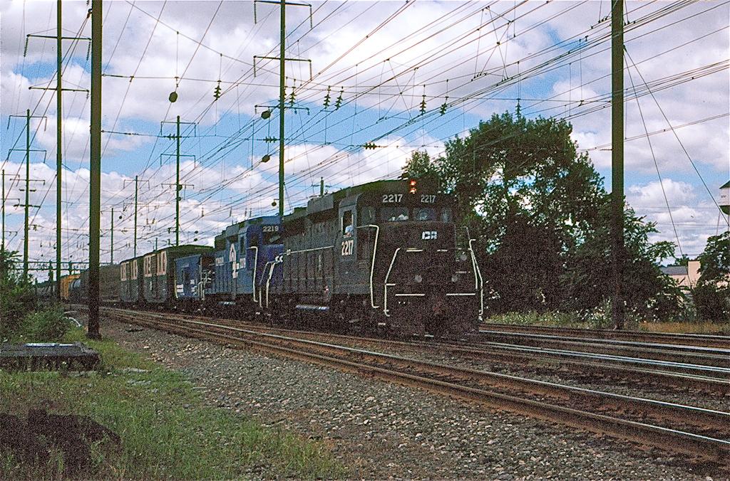 Ex-PC GP30's 2217 and 2219 pull freight through Morrisville in August, 1979.