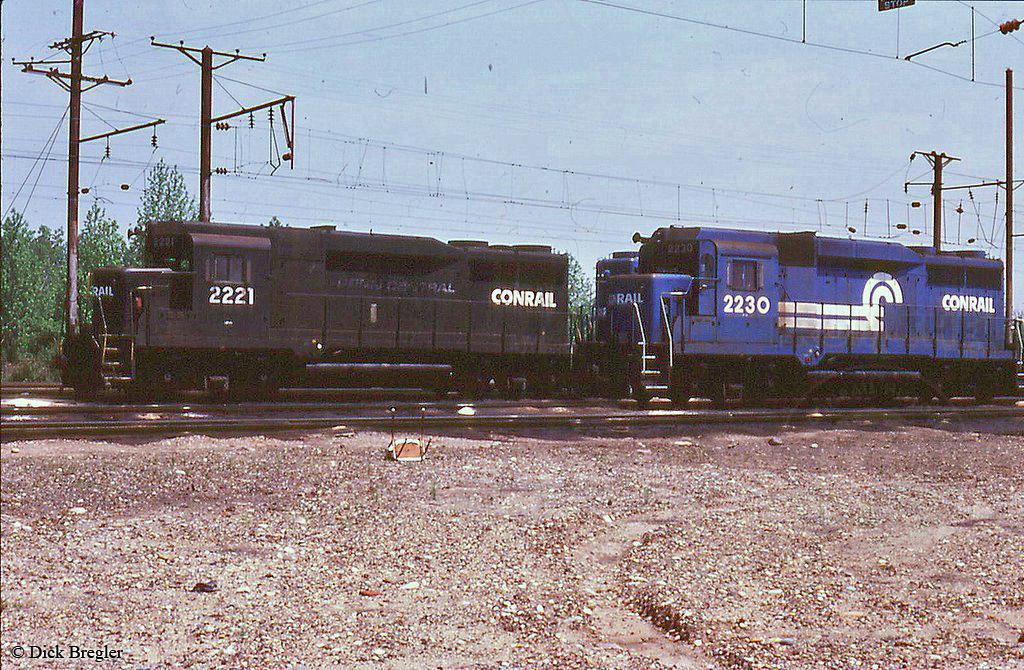 Conrail GP30 2221 (ex-PC 2221, nee-PRR 2221) and 2230 (ex-PC 2230, nee-PRR 2230) are seen at Morrisville, PA in 1981.