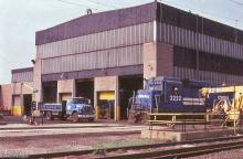 Conrail GP30 2222 sits outside the Morrisville diesel shop in 1981.