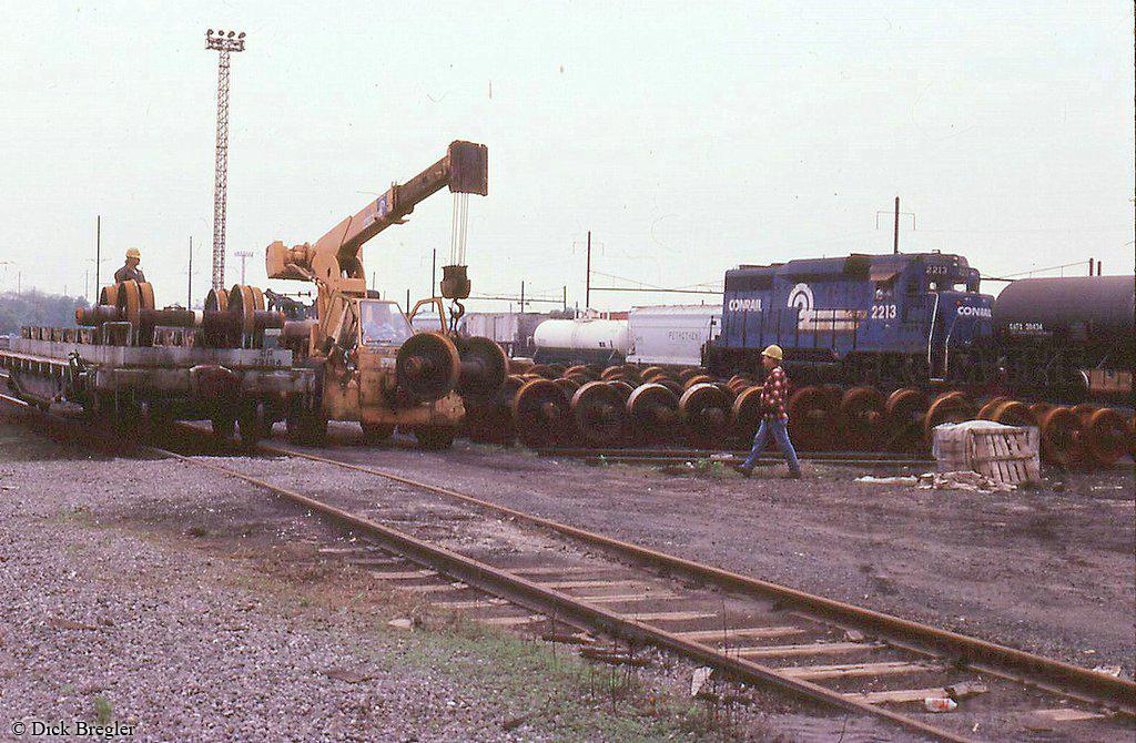 Conrail GP30 2231 (ex-PC 2231, nee-PRR 2231) is shifting cars at Morrisville, PA while a crane offloads a CR wheel flatcar outside the locomotive shop in 1981.