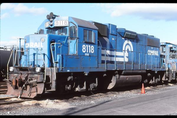 Conrail GP30 2243, still in patched PC Paint, and a ConrailGP38 of some kind headthe James E. Strates Show circus train out of Elmira, New York.