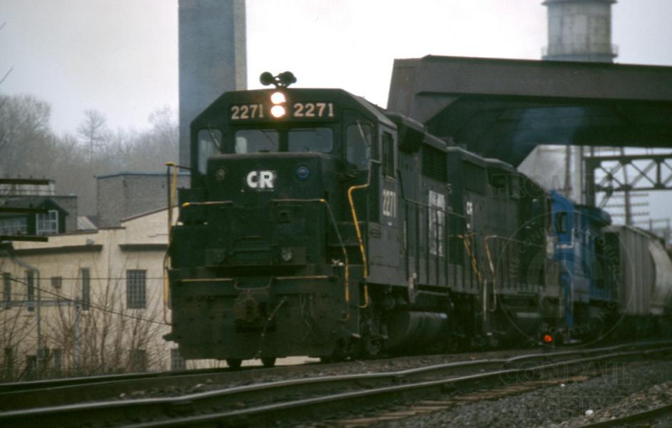 Conrail (Ex PC) GP35 #2271 leads a westbound across the Lehigh Canal in Allentown, PA. April 15, 1984