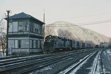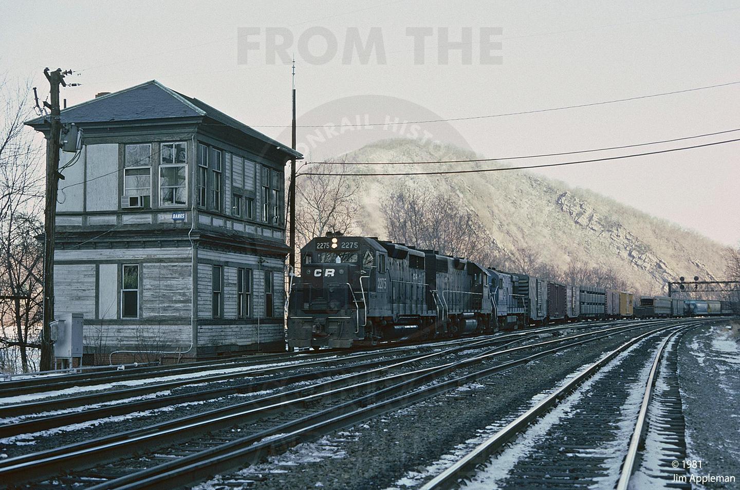 CR 2275 GP35 heads west leading a manifest freight by Banks Tower in the deep shadows of this sunny, early January day.