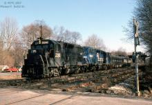 CR 2286 leads a westbound shop extra across Wood Lane in Gladwyne, PA. March 18, 1979