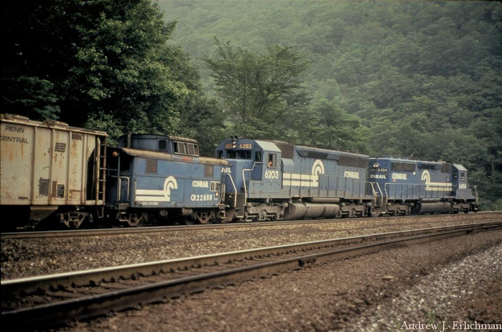 Helper duo CR SD-45 6203 (ex-PC) and 1979-built SD-40-2 6494 push hard on N-5B class cabin CR 22888 (ex-PRR 477767) as they head up the Curve in August, 1981.