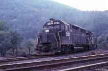 CR GP35 2292 (ex-PC 2292) and GP38-2 7983 (ex-PC 7983) are leading a coal train out of Enola Yard onto Rockville Bridge at Marysville, PA in 1979.