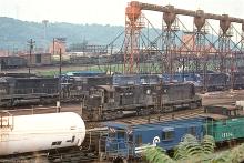 Previous Next With Alco C425's 2416 and 2446 in the foreground, former PC GP35 2297 rests between SD45 6163 and SD45-2 6657 (ex-EL 3672) at a busy Conway engine terminal in August, 1977. Photo By Alan Page Year 1977 Original Date 8/8/77 Location City Conway PA Location Details Conway yard Equipment Type EMD GP35 Conrail Number 2297 2416 2446 6160 Predecessor Paint Scheme PC Collection CRHS Conrail Photo Archive Contributions