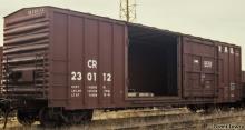 Conrail 230112 is seen in storage at Rutherford, PA with a replacement Youngstown plug door. As-built, these cars had the unique Landis vertically-ribbed plug doors. Car is ex NYC 48392.