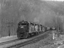 GP35 2304 leads RISE past MP 129 in Becket, MA. on Nov. 28, 1981.