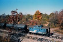 Conrail class N5C caboose No. 23057 brings up the rear of a westbound freight at Hudson Lake, IN in Oct. 1982. Doug Davidson photo with permission