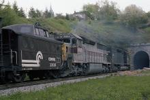 Brown CR caboose 23120 is getting a shove up the mountain by pushers 6659 & 6341.