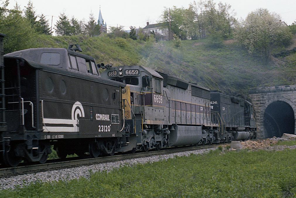 Brown CR caboose 23120 is getting a shove up the mountain by pushers 6659 & 6341.