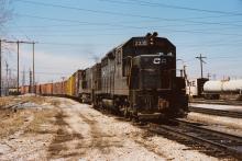 A Conrail eastbound with GP35 2335 on the point rolls through Calumet Park Interlocking in April 1979. Doug Davidson photo permission