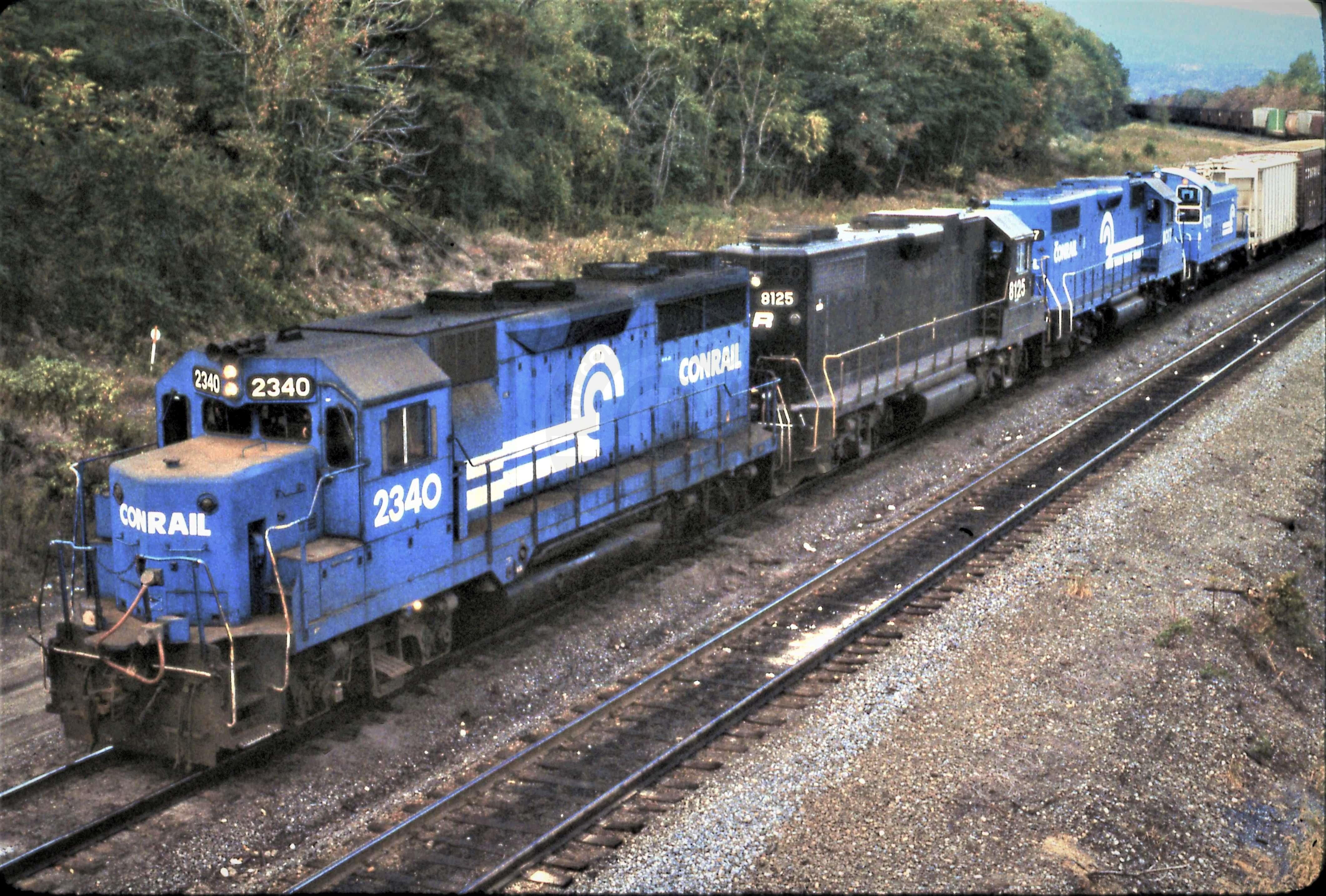 GP35 #2340, GP38-2 #8125, #8017 & SW1200 #9373. Enola, PA. Sept 1983