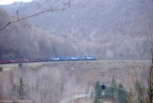 A trio of CR blue, led by GP-35 2357, 3628 (ex-RDG), and GP-40 3264 glides loads of coal down Horseshoe in March, 1981.