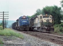 CR 2367 leads an empty westbound hopper train past a westbound manifest freight led by CR 3646, stopped on Muncy Siding, waiting for it to pass.