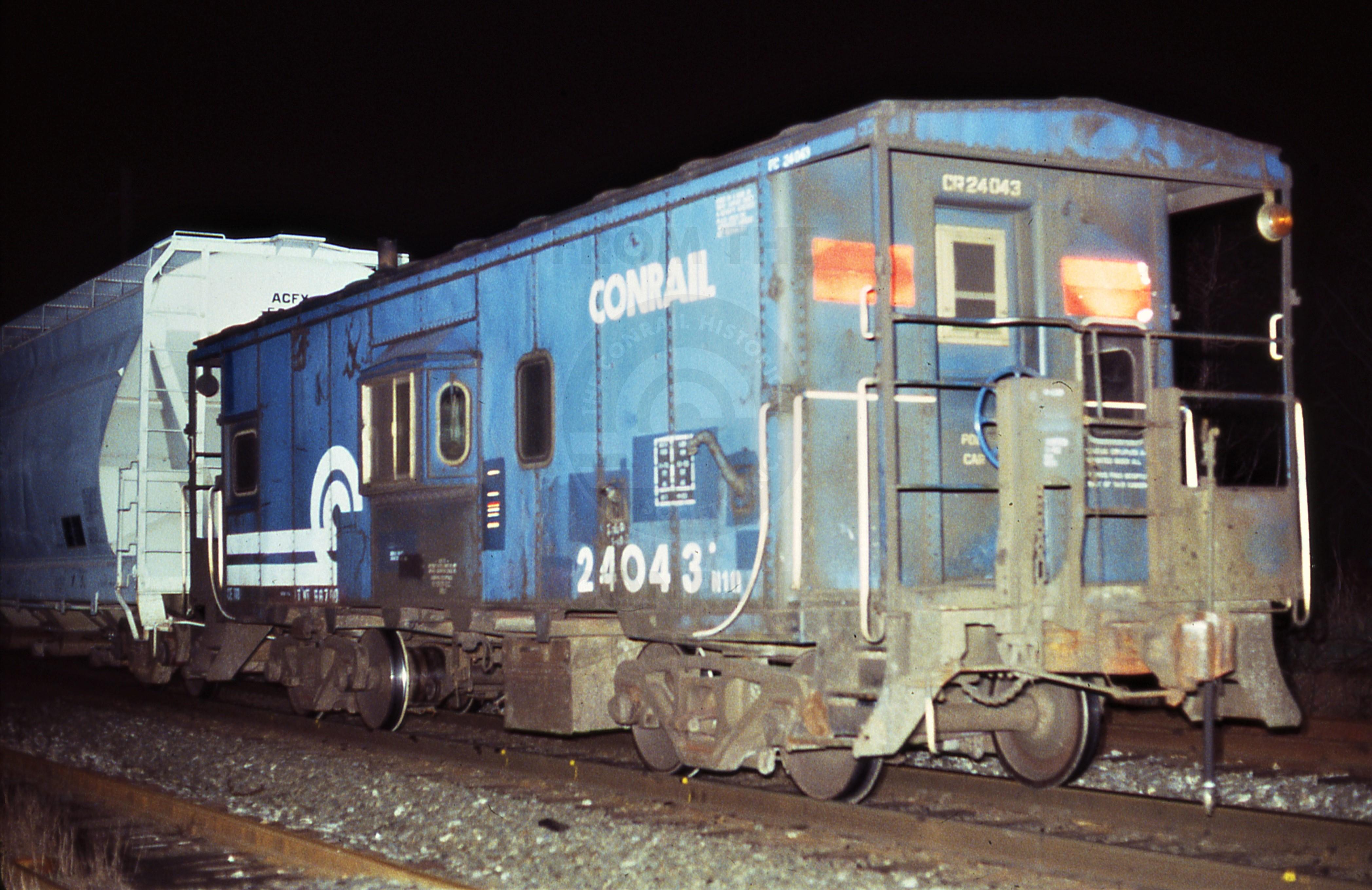 Conrail N10 caboose #24043 on westbound freight at the New Market Road crossing in Piscataway, NJ on May 14, 1986 N10 caboose; AAR type M930; former Penn Central caboose.