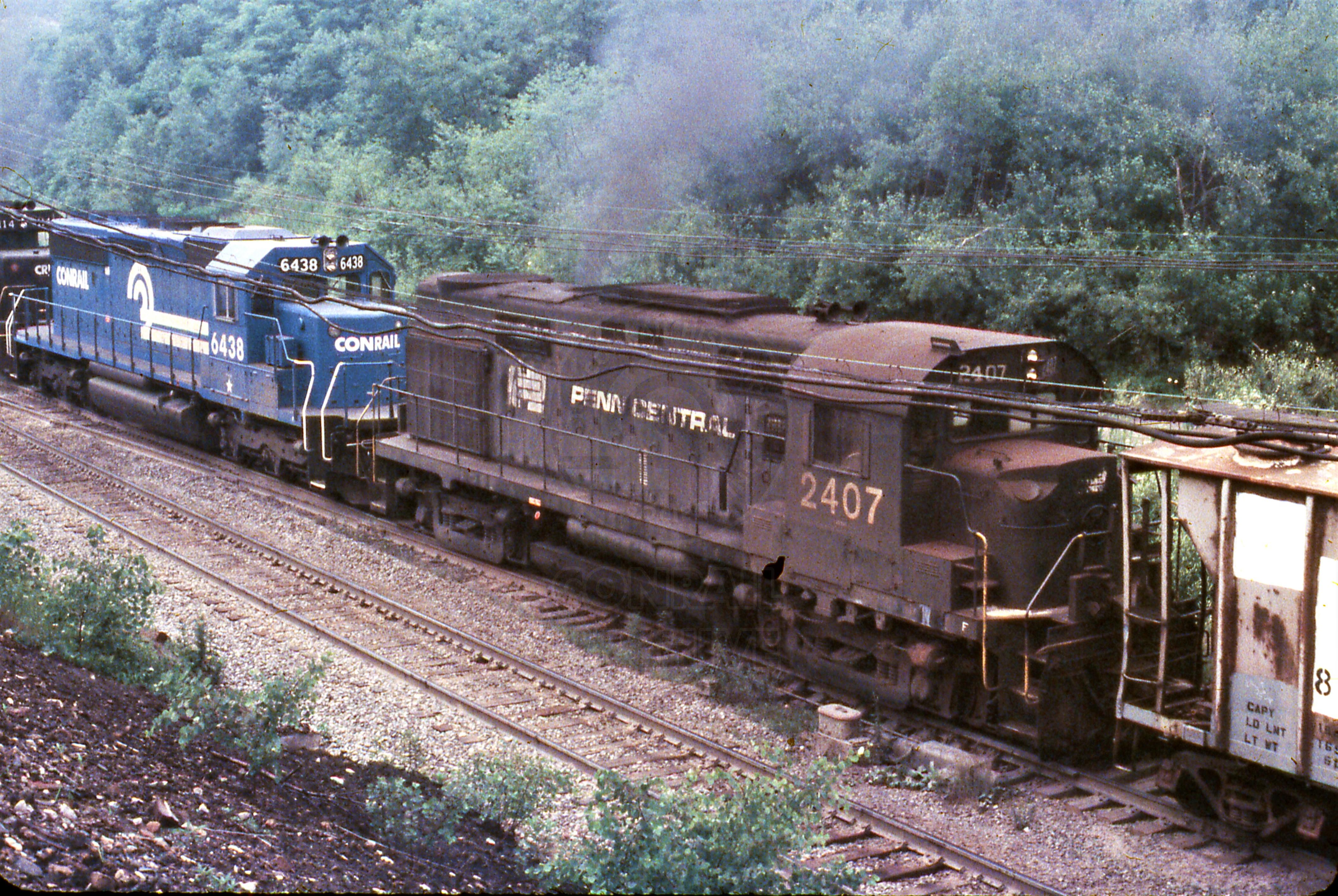 Conrail. Alco RS-27 #2407 on freight arriving at Enola yards on July 16, 1978