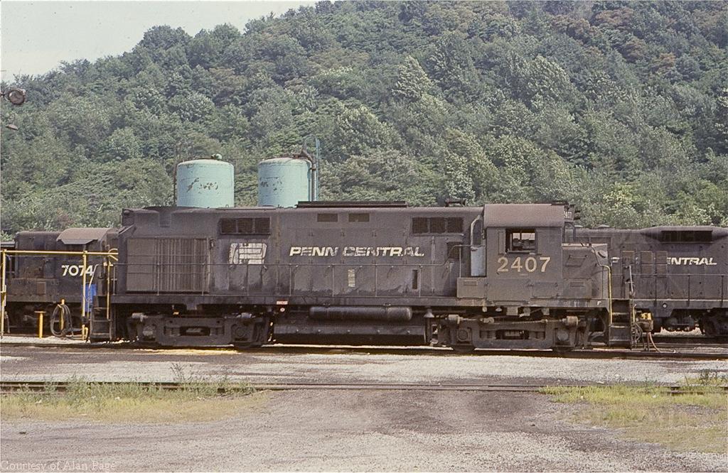 With former GP-9's 7074 and 7014 behind, former PC RS-27 2407 waits between assignments at the Weirton, WV engine terminal in August, 1978.