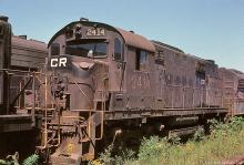 Formerly Conway-based ex-PC RS-27 2414 rests retired in the Juniata shops deadline in August, 1977.