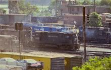 With the yard towers overlooking the westbound yard and hump in the background, former PC Alco C425 2423 moves through the lines of GE and EMD power at the busy Enola engine terminal in July, 1978.