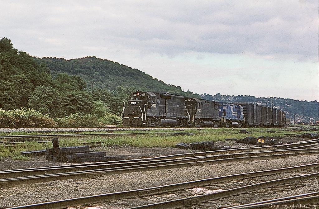 CR GP-40 3227 leads C425's 2434 and 2425 through Pitcairn, PA in August, 1978.
