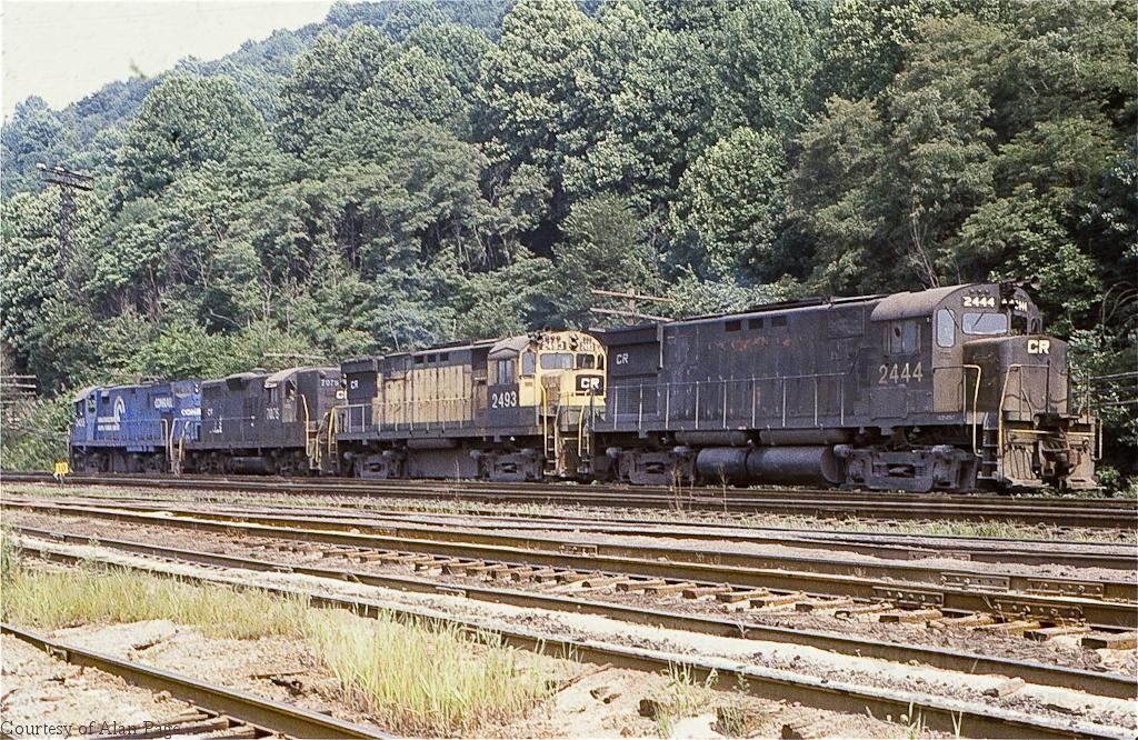 Former PC C425 2444 leads C424 2493 (ex-RDG 5204), GP9 7076, and C425 2455 in a quartet of CR power at Weirton, WV in August, 1978.
