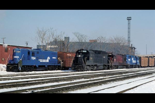Cold and snow during February of 1978 made things pretty tough for Conrail in Northern Ohio. Two trains sit outlawed at South St TBS in Akron, a Cinci to Meadville freight with ex EL C424 #2484 leading, and the west local with ex PC GP-9 #7356.