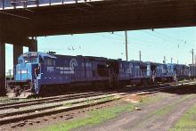 CR B23-7 1905 leads U30B 2846, U25B 2512, and U33B 2901 in a quartet of GE units through Morrisville in June, 1979.