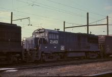 Former PC U25B 2543 rolls through Morrisville yard in an all PC black consist in March, 1977.