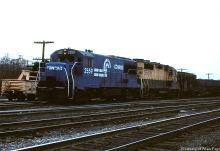 CR U25B 2559 and ex-RDG GP-35 3638 pull through Abrams in February, 1977.