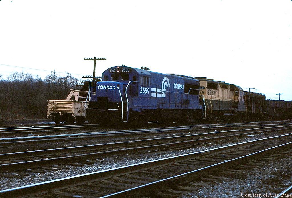CR U25B 2559 and ex-RDG GP-35 3638 pull through Abrams in February, 1977.